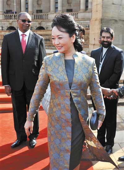 3月26日,南非比勒陀利亞,彭麗媛的著裝引發(fā)“中國風”熱議。