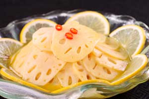 2:將糖、醋、鹽倒入蓮藕中拌入味,擺盤時可將一些辣椒圈撒在上面裝飾即可。