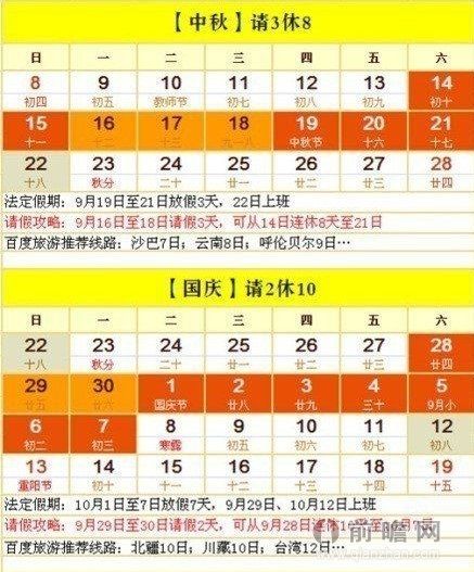 攻略三:請11天休24天!先按上面兩種情況,申請中秋8天和國慶10天的假期,然后在9月22日-27日請假,共請假11天,即可享受“超值24天放假套餐”!