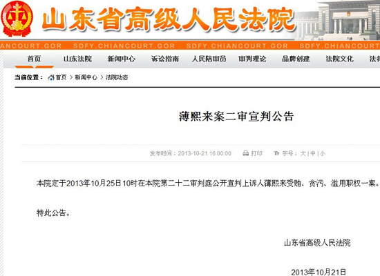 人民網(wǎng)北京10月21日電 山東省高級(jí)人民法院今日發(fā)布公告,10月25日10時(shí)將公開宣判上訴人薄熙來受賄、貪污、濫用職權(quán)一案。