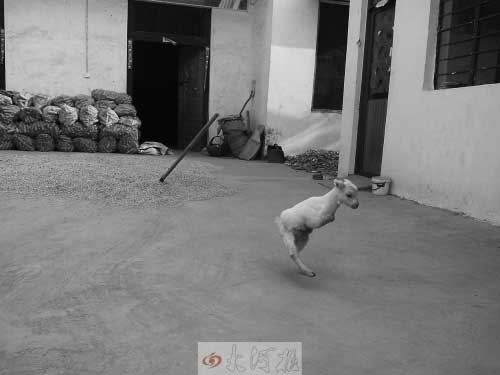 據(jù)羊的主人今年60多歲的趙大娘介紹,她家里飼養(yǎng)的一只母羊以前生出的小羊都很健全,可今年8月份,這只母羊產(chǎn)下4只小羊,其中一只卻只有兩條腿。一個月后,這只小羊開始慢慢學(xué)著用兩條后腿行走。又過了一個月,這只小羊就會用它僅有的兩條腿正常行走了。“我都60多歲了,這還是第一次看到只有兩條腿的羊!壁w大娘說,鄉(xiāng)里一名獸醫(yī)曾經(jīng)來看過,趙大娘詢問為啥小羊生下只有兩條腿,獸醫(yī)稱,有可能是基因變異所致。