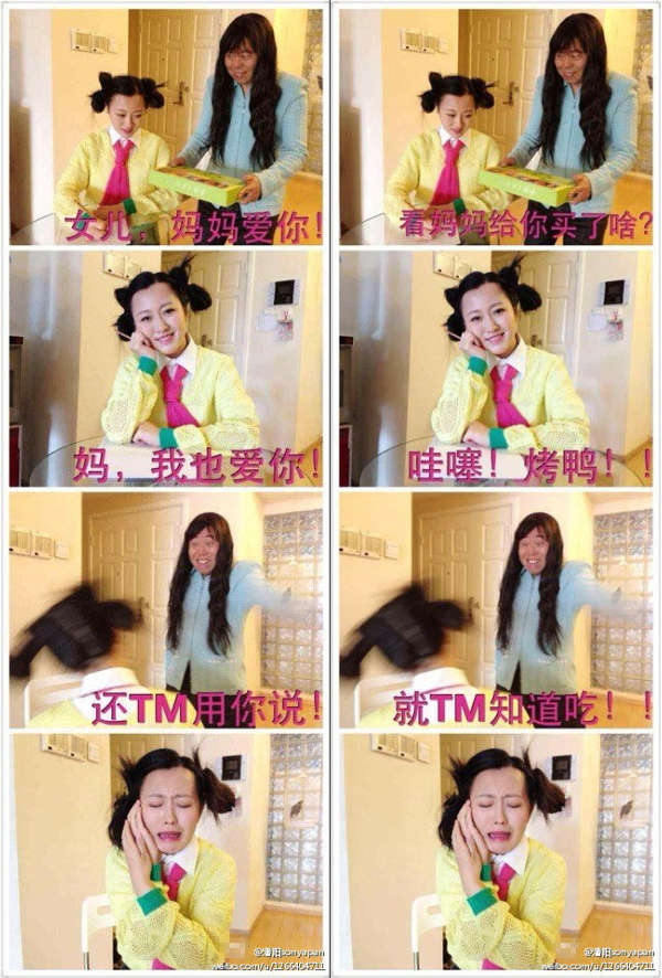 近日微博上“媽媽再打我一次”系列漫畫瘋狂走紅,網(wǎng)友們紛紛發(fā)揮才智P圖連載。而今天下午,著名喜劇演員在自己的微博上曬出一組照片,圖中正是他與自己的女兒版本的“媽媽再打我一次”。他本人稱:完全不知道在什么情況下被女兒拍了這組照片。